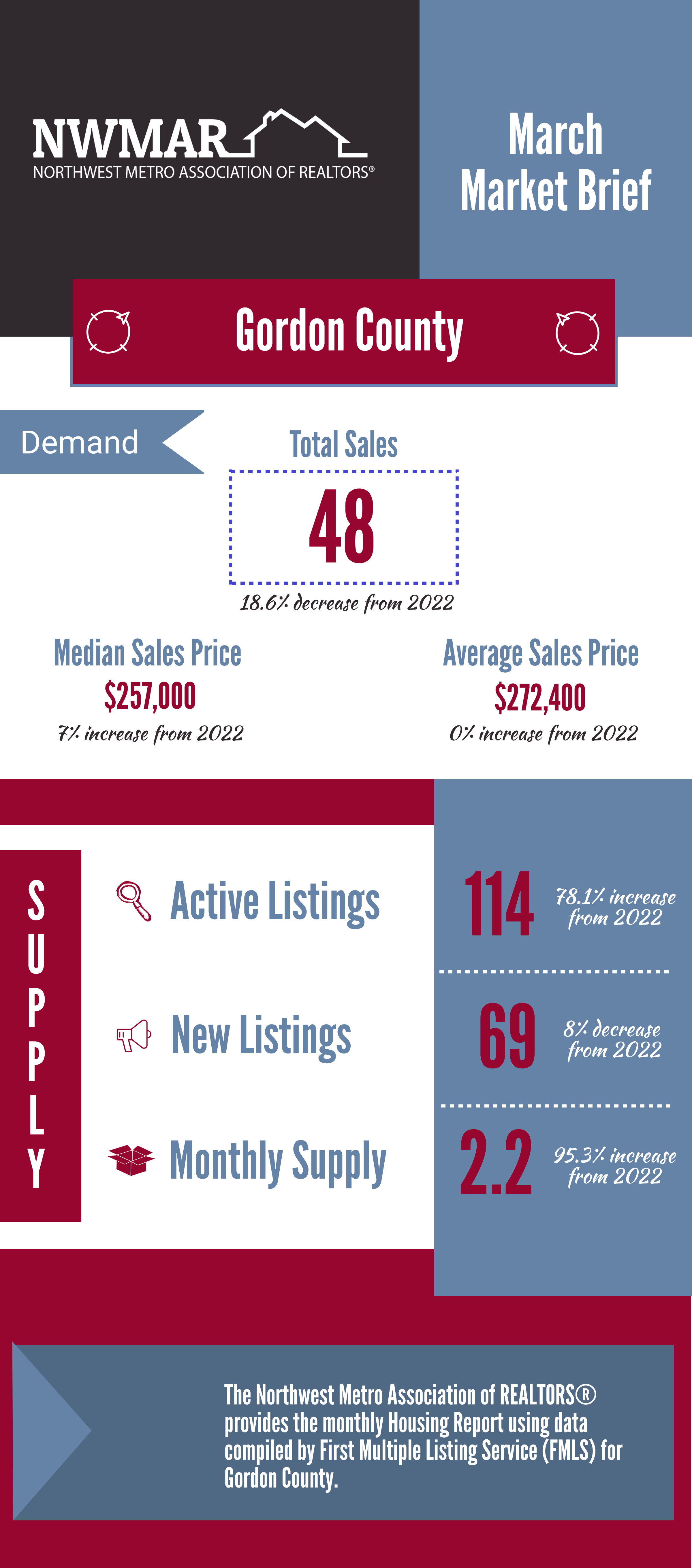 The Northwest Metro Association of REALTORS® provides the monthly Market Update using data compiled by First Multiple Listing Service (FMLS).