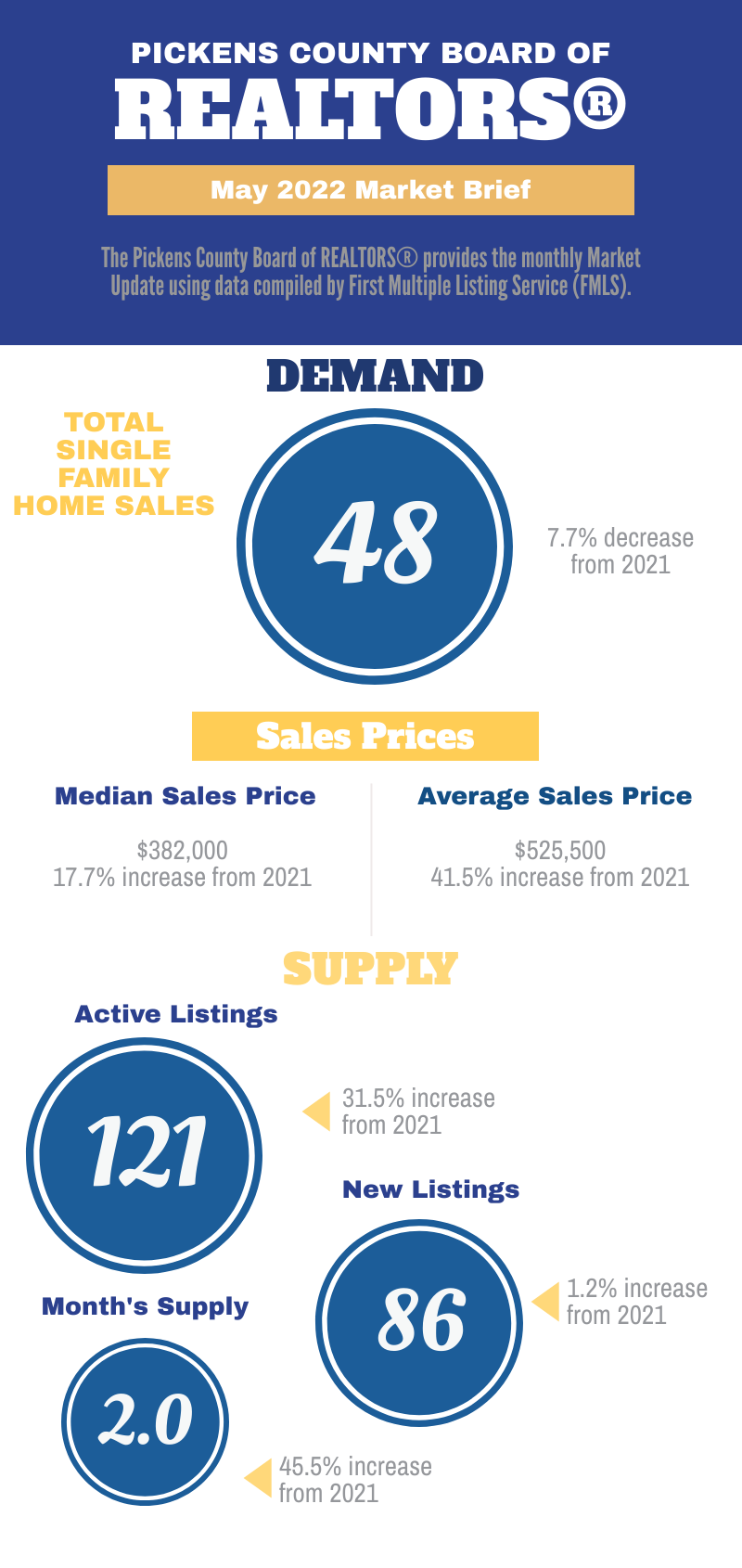 The Pickens County Board of REALTORS® provides the monthly Market Update using data compiled by First Multiple Listing Service (FMLS).